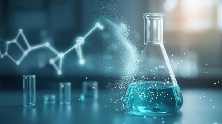 Synthetic chemical powder mixing with liquid, close up, dissolution theme, surreal, composite, glass flask backdrop