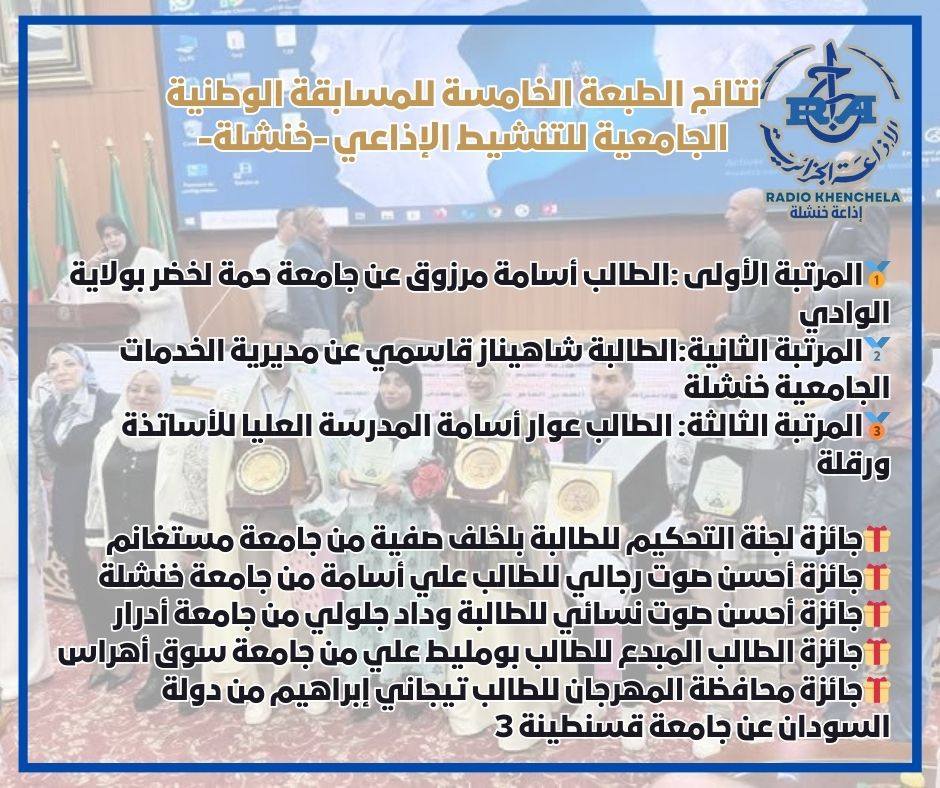 تُقدم مديرية الخدمات الجامعية وجامعة عباس لغرور خنشلة أحر التهاني للطالبين المتميزين على هذا الإنجاز الوطني، الذي يعكس جودة التدريب والإبداع في المجال الإعلامي الجامعي.