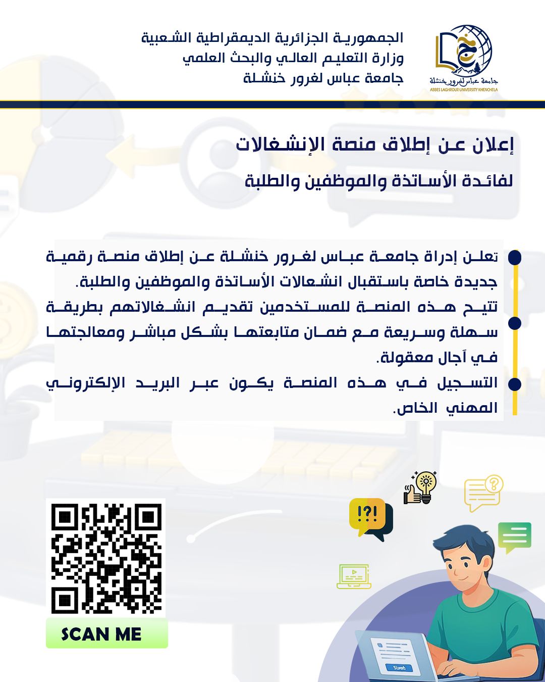 إعــلان عن إطــلاق منصـة الإنشـغالات؛ لفـائدة الأساتذة والمـوظفيـن والطـلـبة