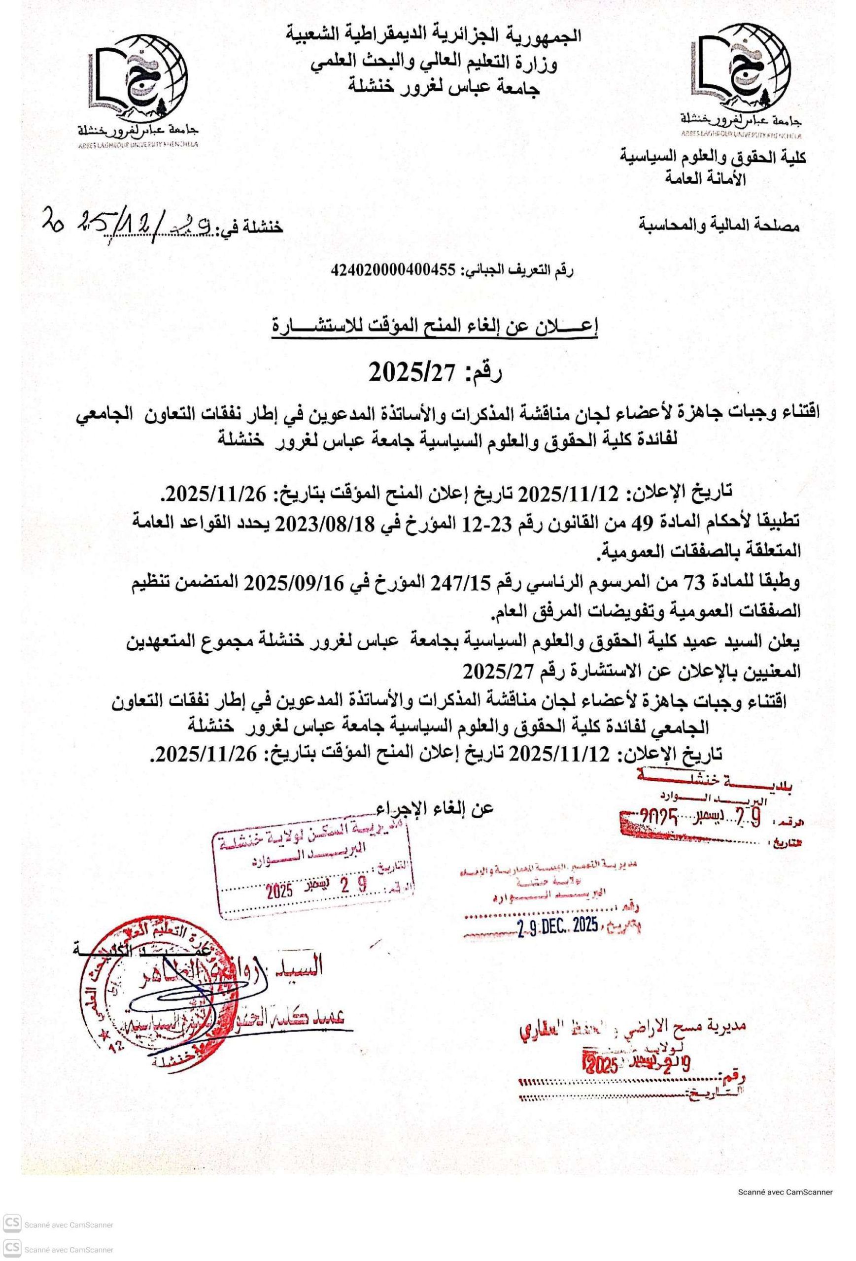 إعلان عن إلغاء المنح المؤقت للإستشارة رقم 27/2025