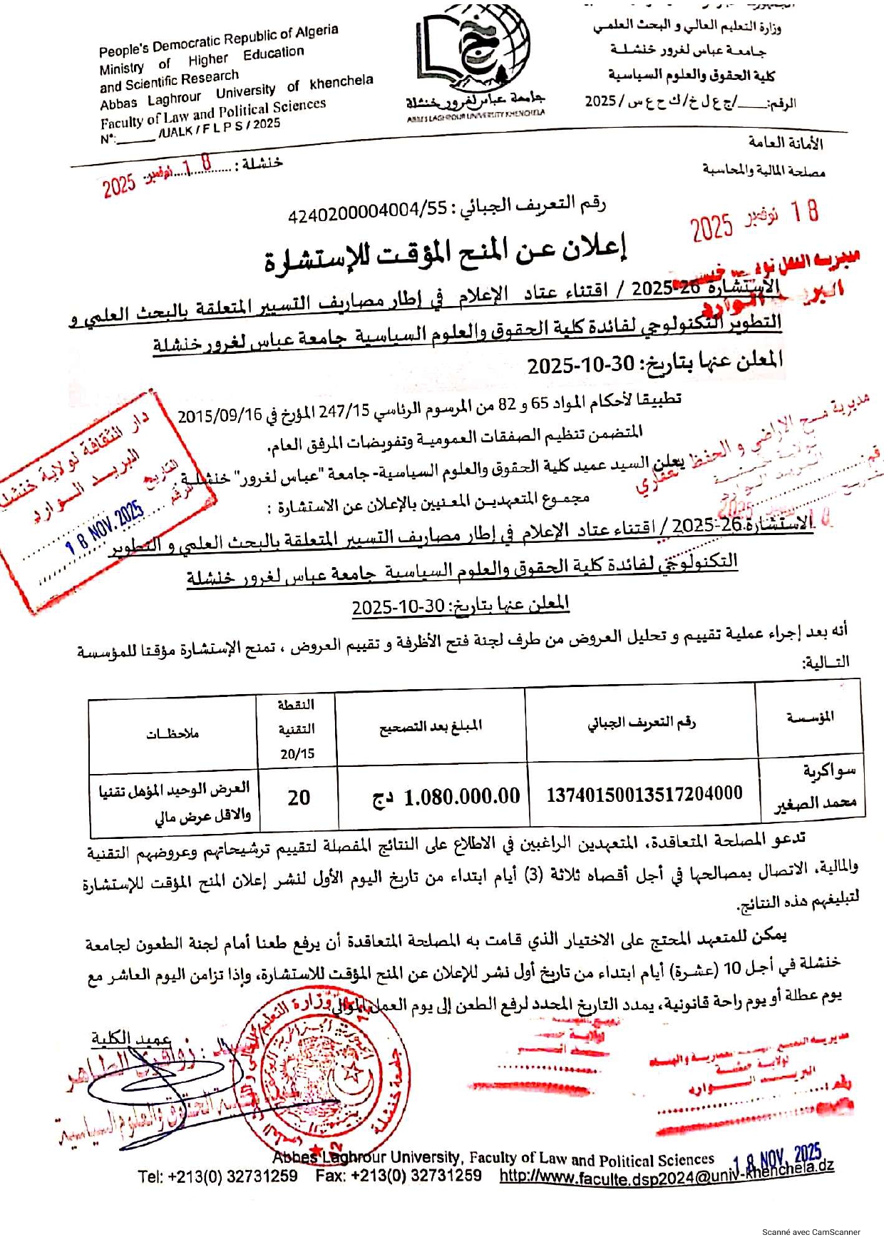 إعلان عن المنح المؤقت للاستشارة رقم 26/2025