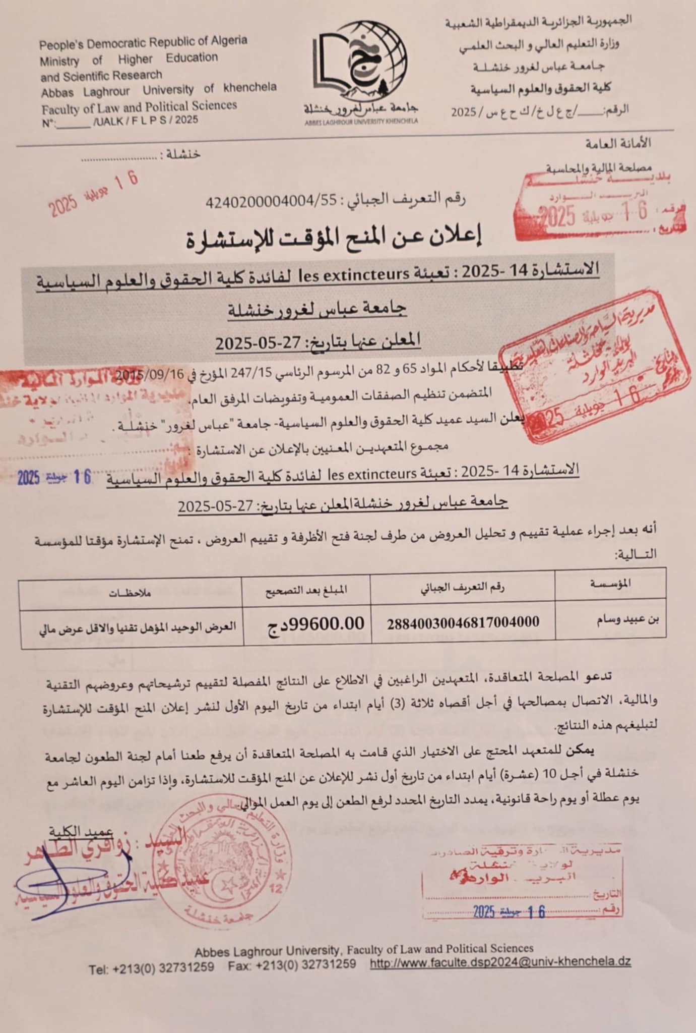 إعلان عن المنح الموقت للإستشارة رقم 2025/14