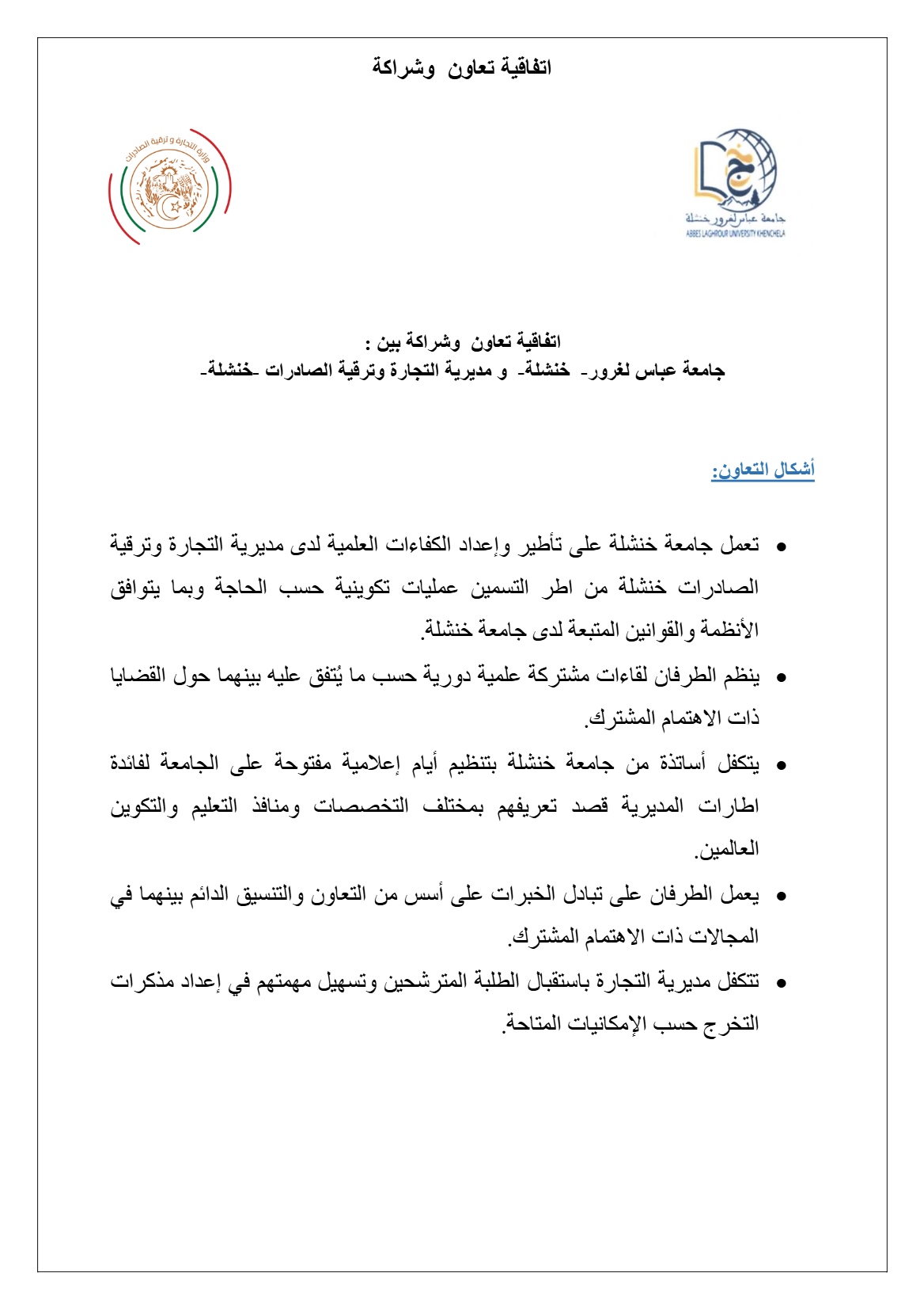 اتفاقية تعاون و شراكة :جامعة عباس لغرور و مديرية التجارة و ترقية الصادرات لولاية خنشلة