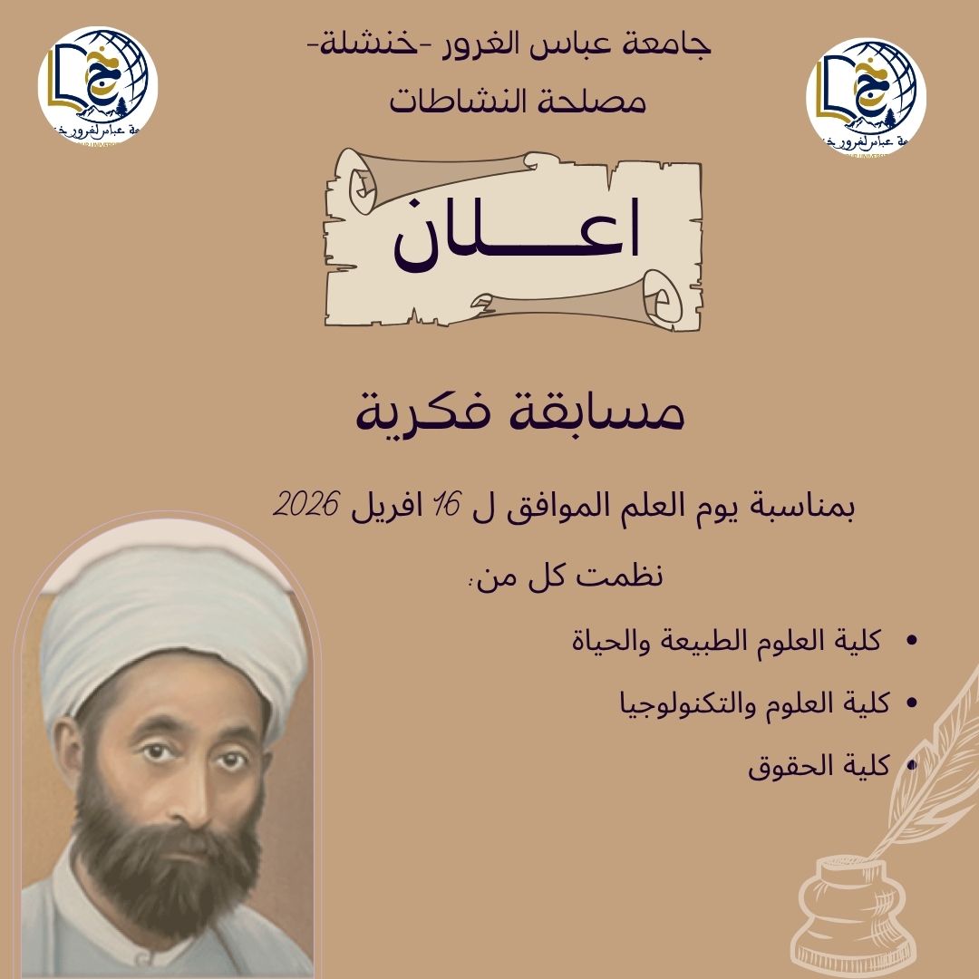 في إطار البرنامج الثقافي والعلمي المسطر من طرف مصلحة النشاطات لجامعة عباس لغرور – خنشلة-، وتخليداً لذكرى يوم العلم التي ترمز للنهضة الفكرية والإصلاحية في الجزائر، يشرفنا إعلام كافة الطلبة والمهتمين بتنظيم “مسابقة فكرية” كبرى تحت شعار المعرفة والتميز الأكاديمي.بين الكليات  كلية الحقوق وكليةالعلوم التكنولوجياوكلية علوم الطبيعة والحياة