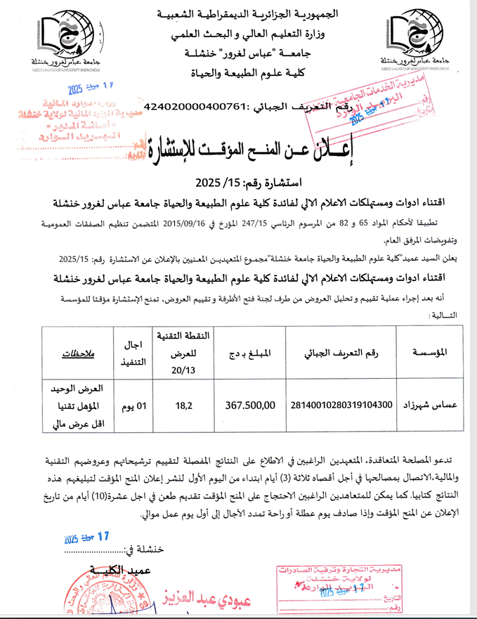 اعلان عن المنح المؤقت للاستشارة رقم:2025/15