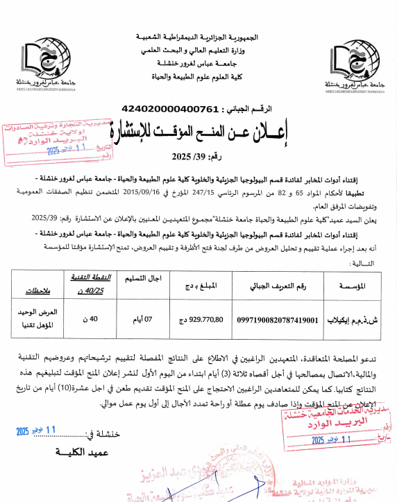 اعلان عن المنح المؤقت للاستشارة رقم:2025/39