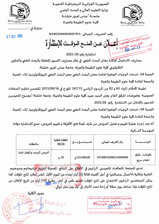 اعلان عن المنح المؤقت للاستشارة رقم:26ح2025/1