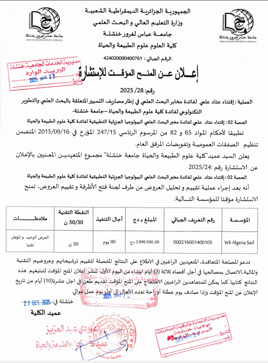 اعلان عن المنح المؤقت للاستشارة رقم:28ح2025/2