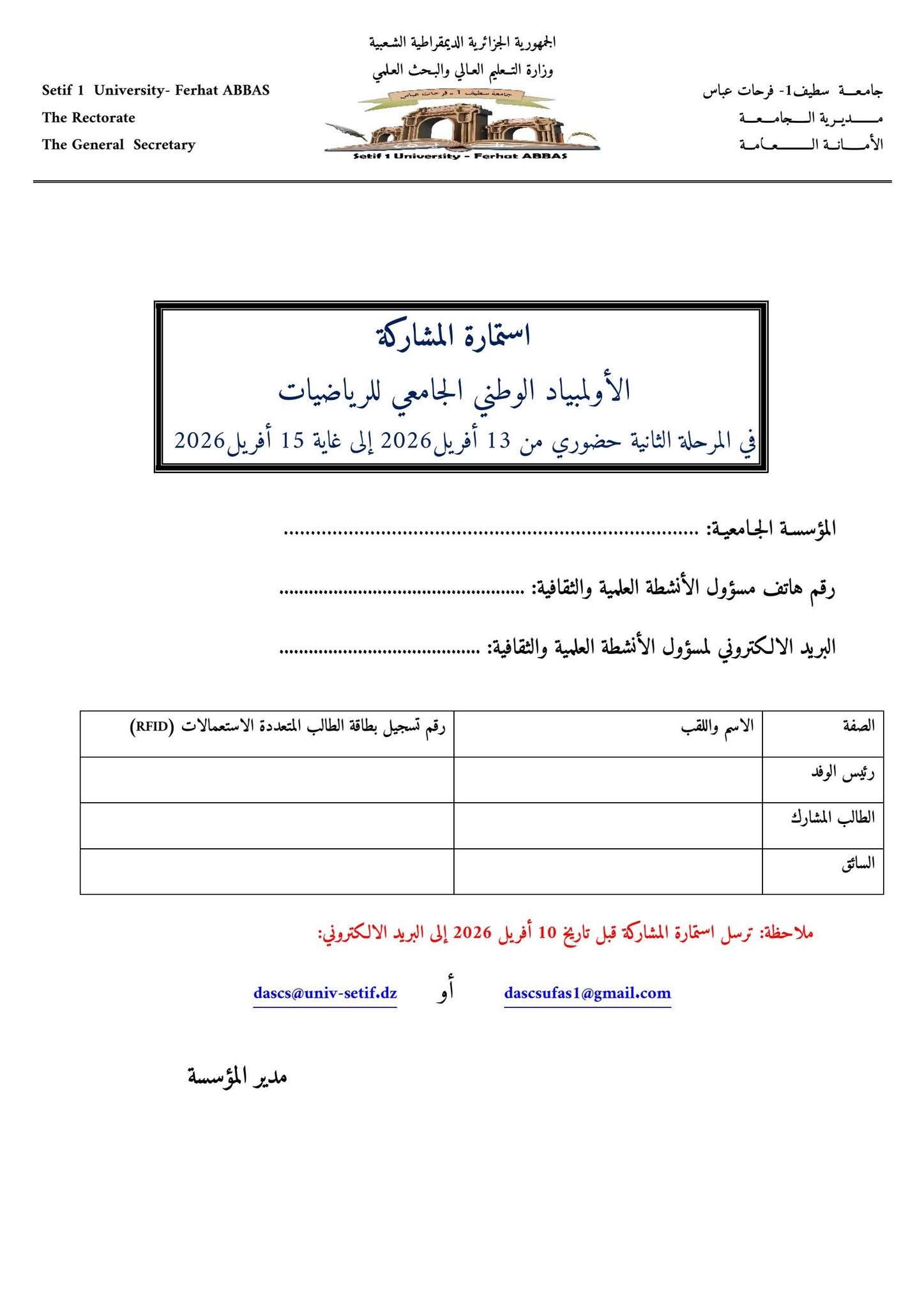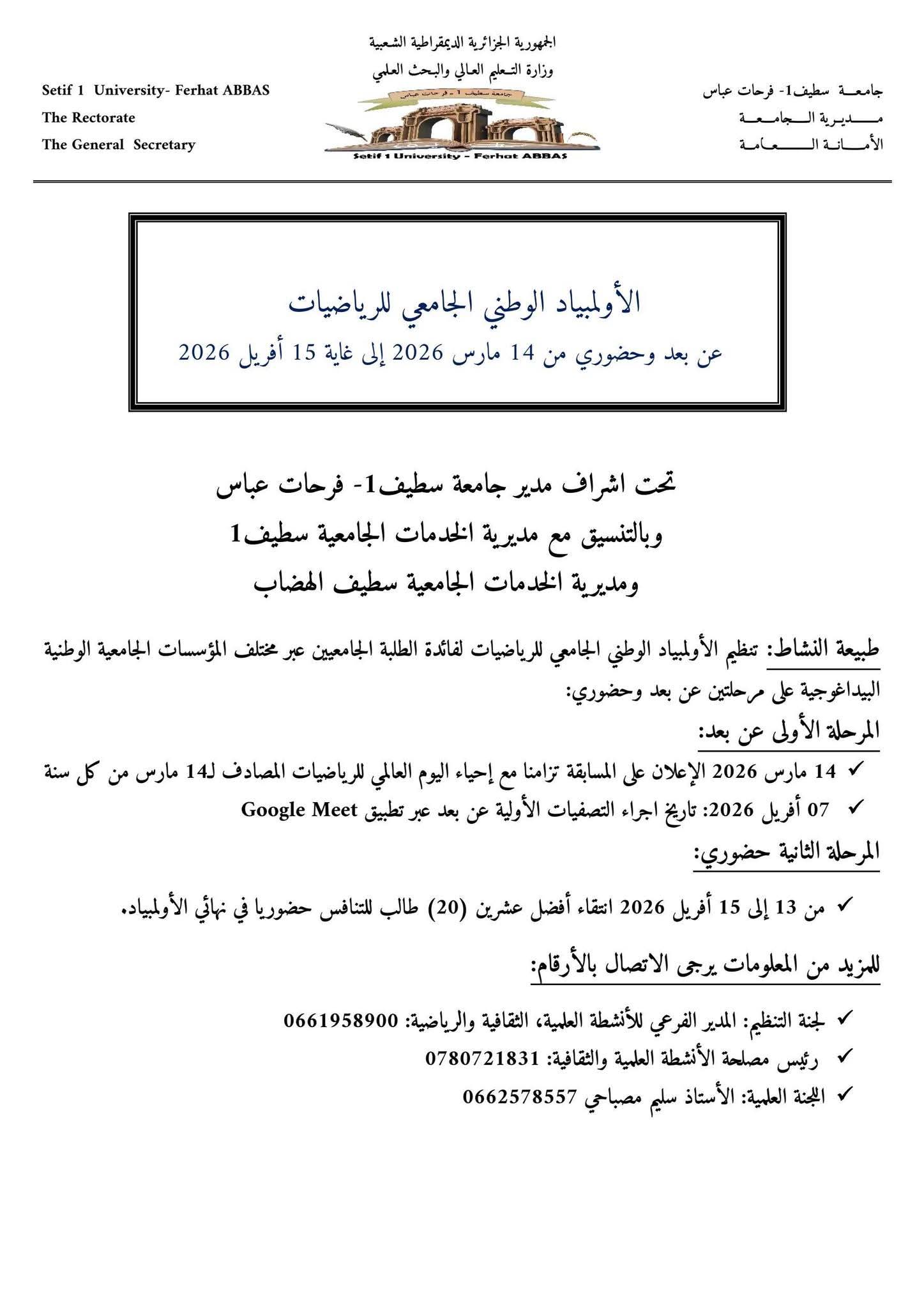 تجسيدا للبرنامج السنوي (2025- 2026)، المتعلق بالأنشطة العلمية والثقافية والرياضية، الذي سطرته مديرية الحياة الطلابية بالتنسيق مع الديوان الوطني للخدمات الجامعية، يشرفني إعلامكم بتنظيم الطبعة الثانية (02) للمسابقة الوطنية الجامعية للأولمبياد الوطني الجامعي للرياضيات، الذي تنظمه #جامعةسطيف01 في الفترة الممتدة من 14 مارس إلى 15 أفريل 2026.