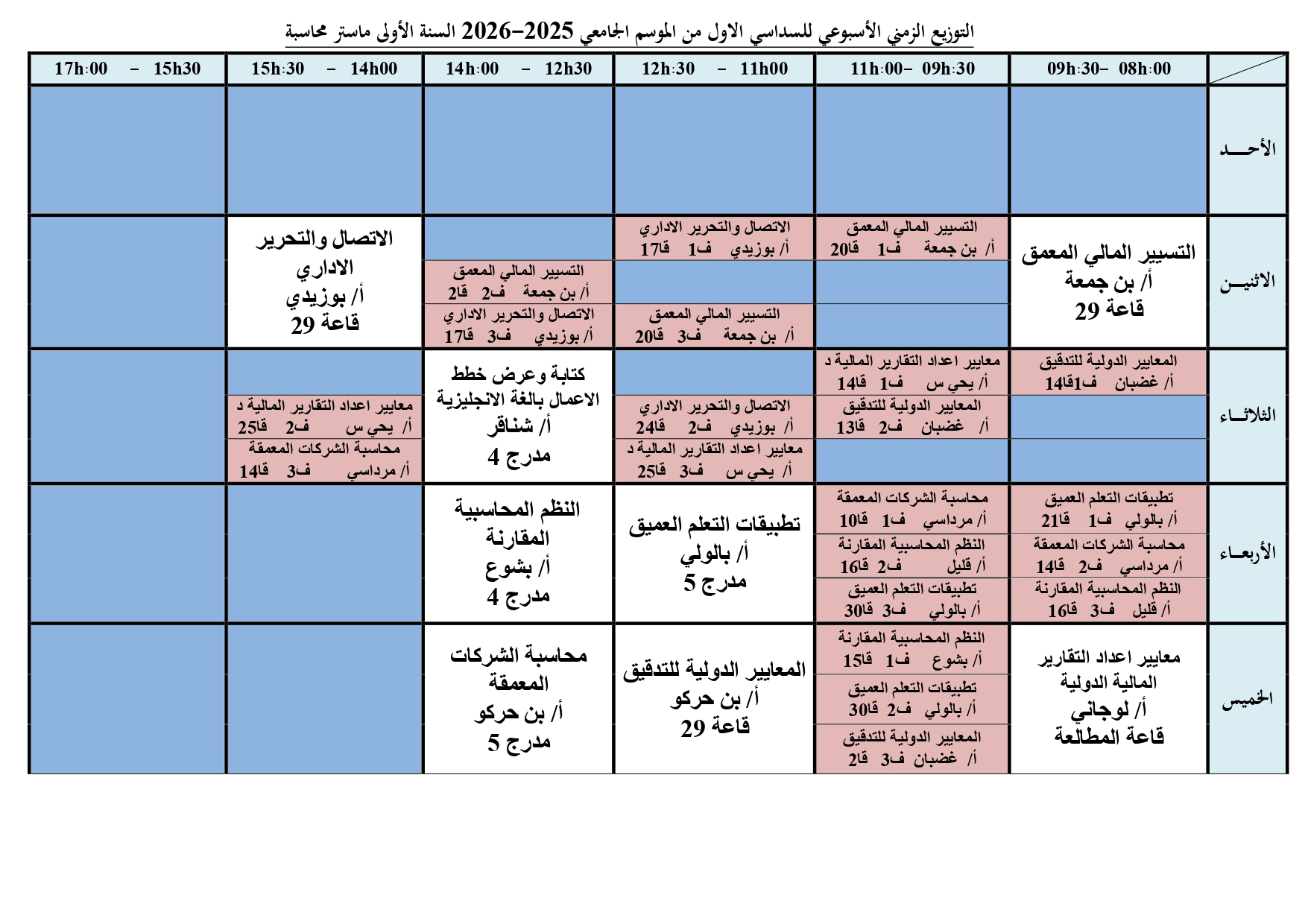 التوزيع الزمني الأسبوعي للسداسي الاول من الموسم الجامعي 2026-2025 السنة الأولى ماستر محاسبة