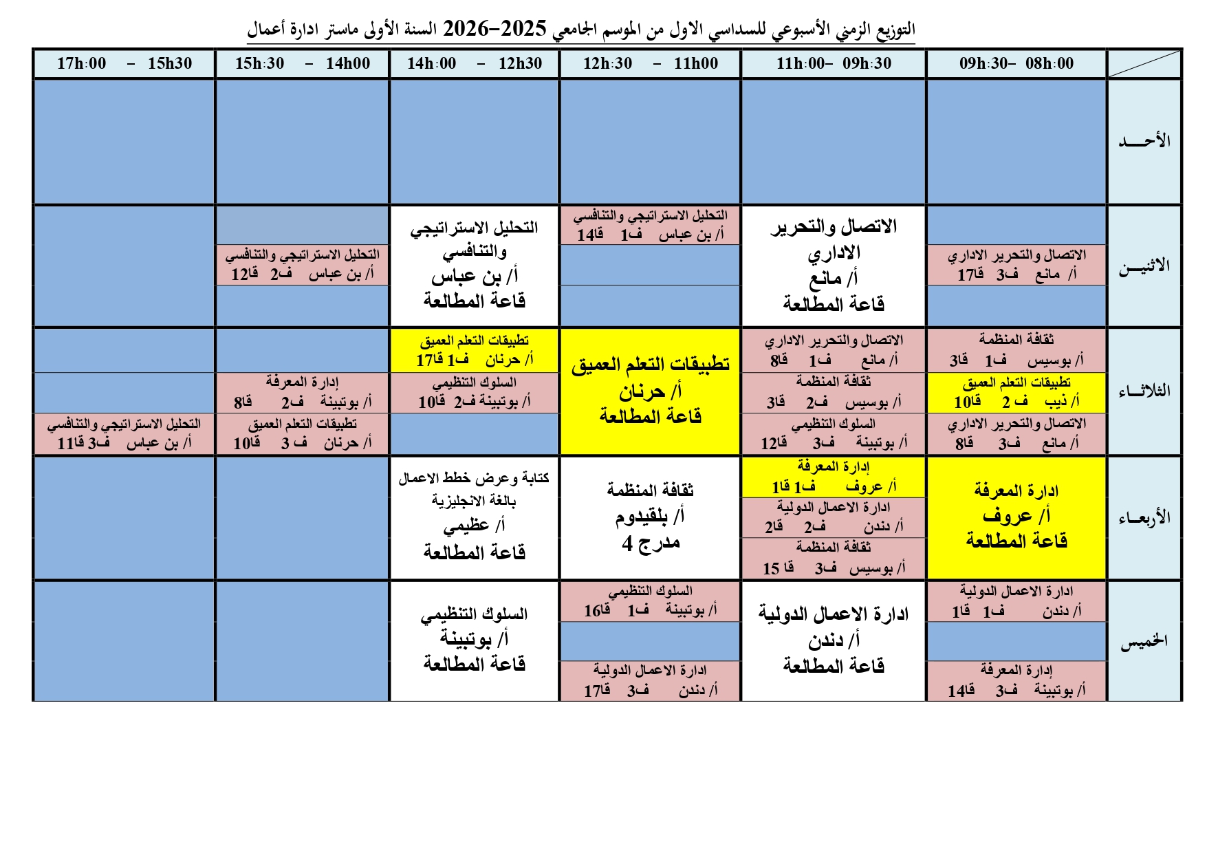 التوزيع الزمني الأسبوعي للسداسي الاول من الموسم الجامعي 2026-2025 السنة الأولى ماستر ادارة أعمال
