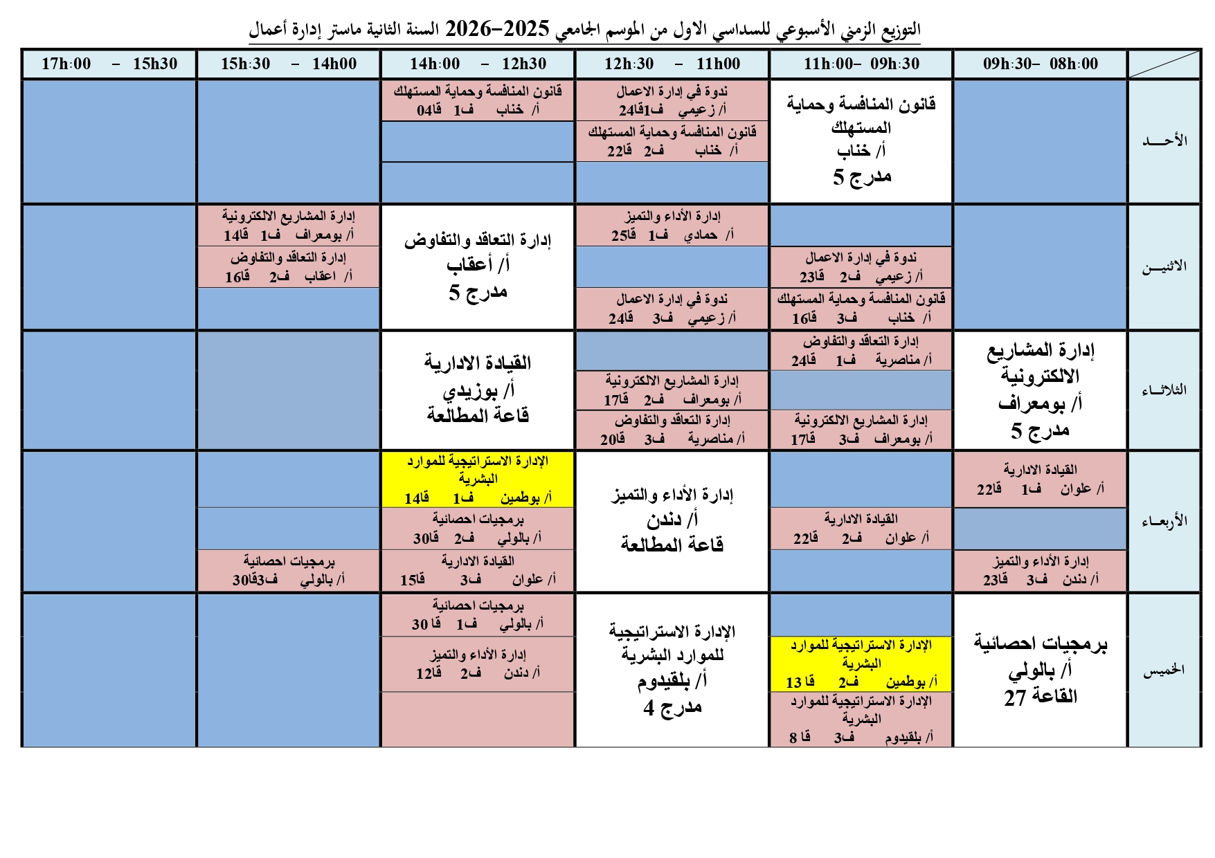 التوزيع الزمني الأسبوعي للسداسي الاول من الموسم الجامعي 2026-2025 السنة الثانية ماستر إدارة أعمال