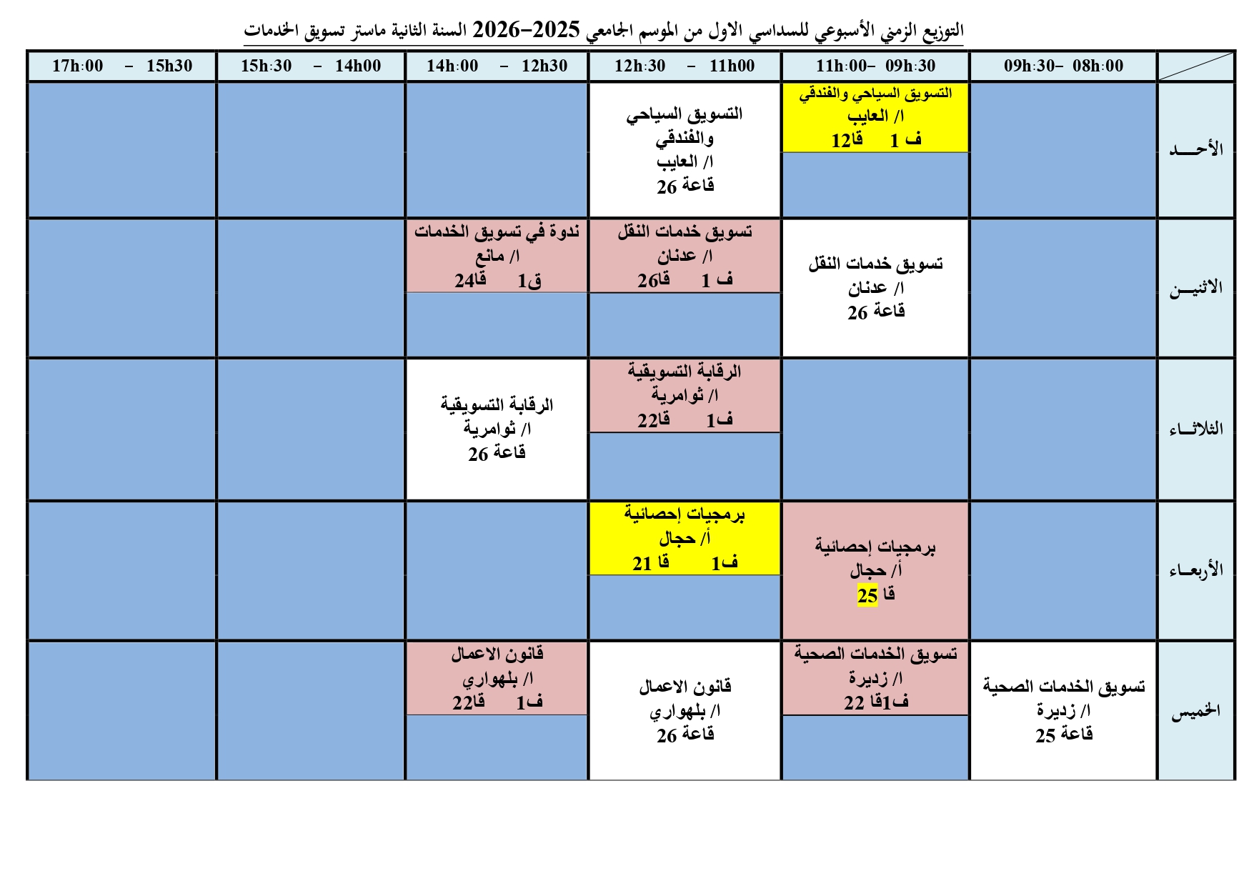 التوزيع الزمني الأسبوعي للسداسي الاول من الموسم الجامعي 2025-2026 السنة الثانية ماستر تسويق الخدمات