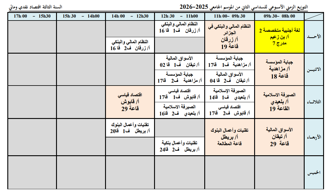 التوزيع الزمني الاسبوعي للسداسي الثاني السنة الثالثة اقتصاد نقدي ومالي