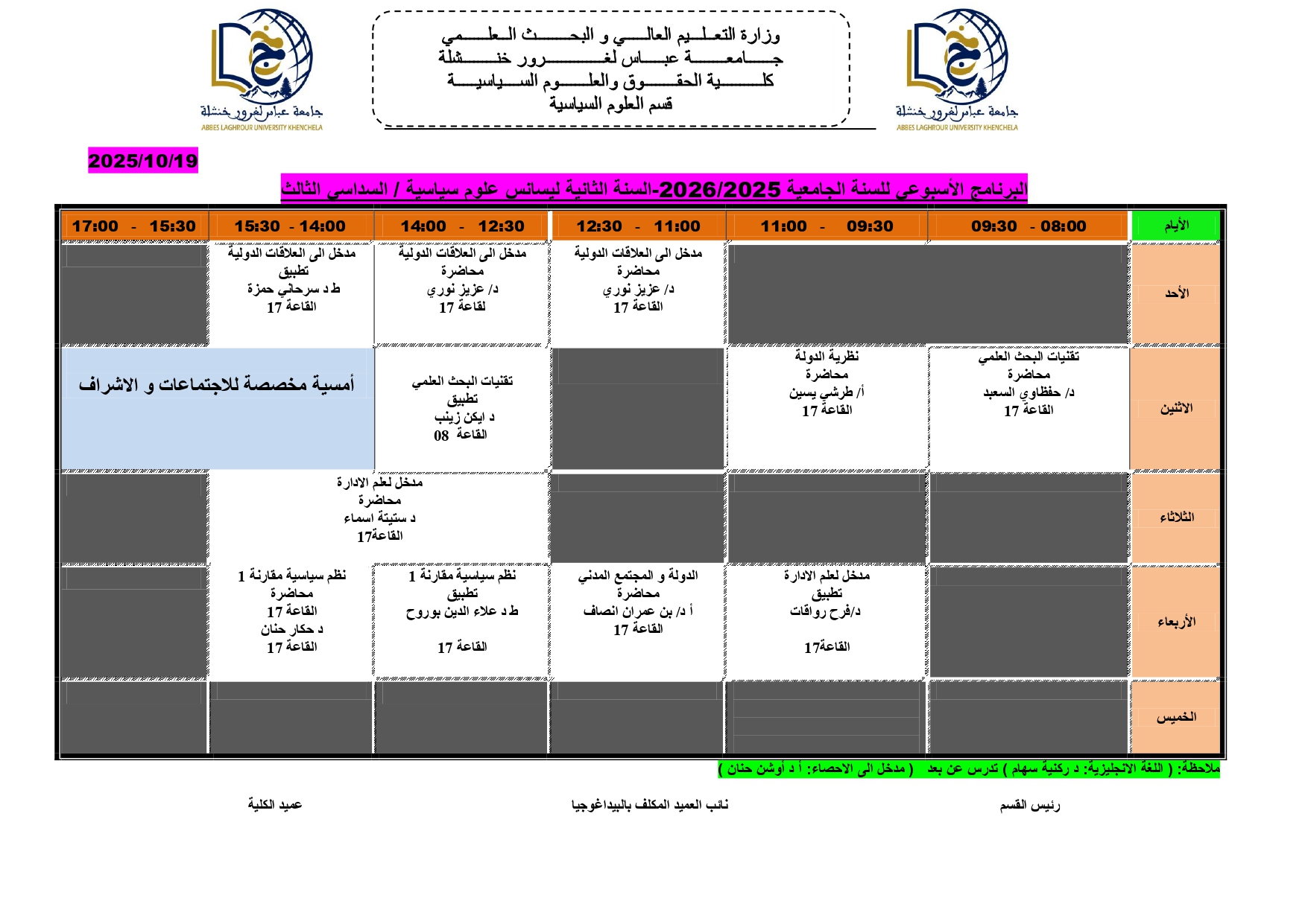 • سابقالتوقيت الاسبوعي علوم سياسية – سنة أولى ليسانس