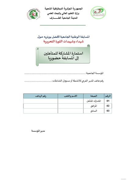 وعليه الرجاء النشر الواسع ليتسنى لجميع الطلبة المشاركة في هذا النشاط الثقافي الهام، على أن ترسل استمارات المشاركة وفقا للمطلوب في البطاقة التقنية.