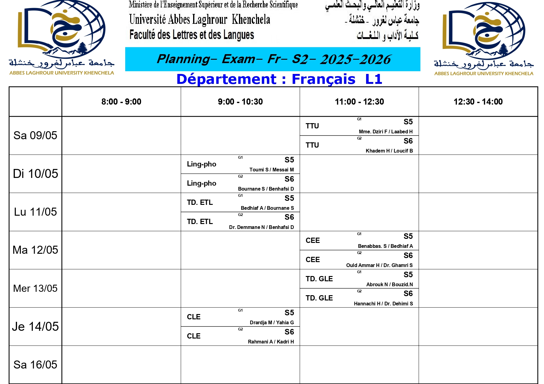 برنامج الإمتحانات-قسم الآداب واللغة الفرنسية-ل1