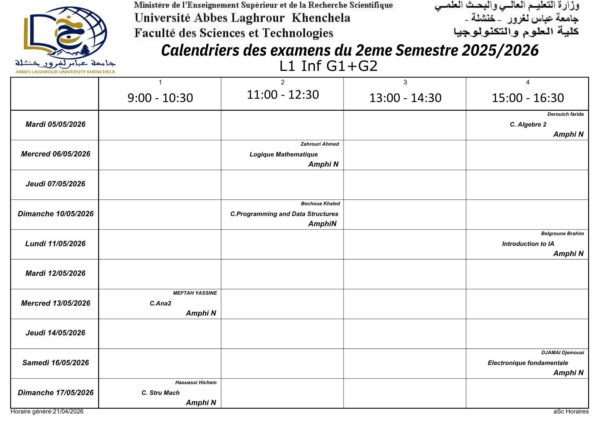 برنامج الإمتحانات-قسم الاعلام الالي -ل1