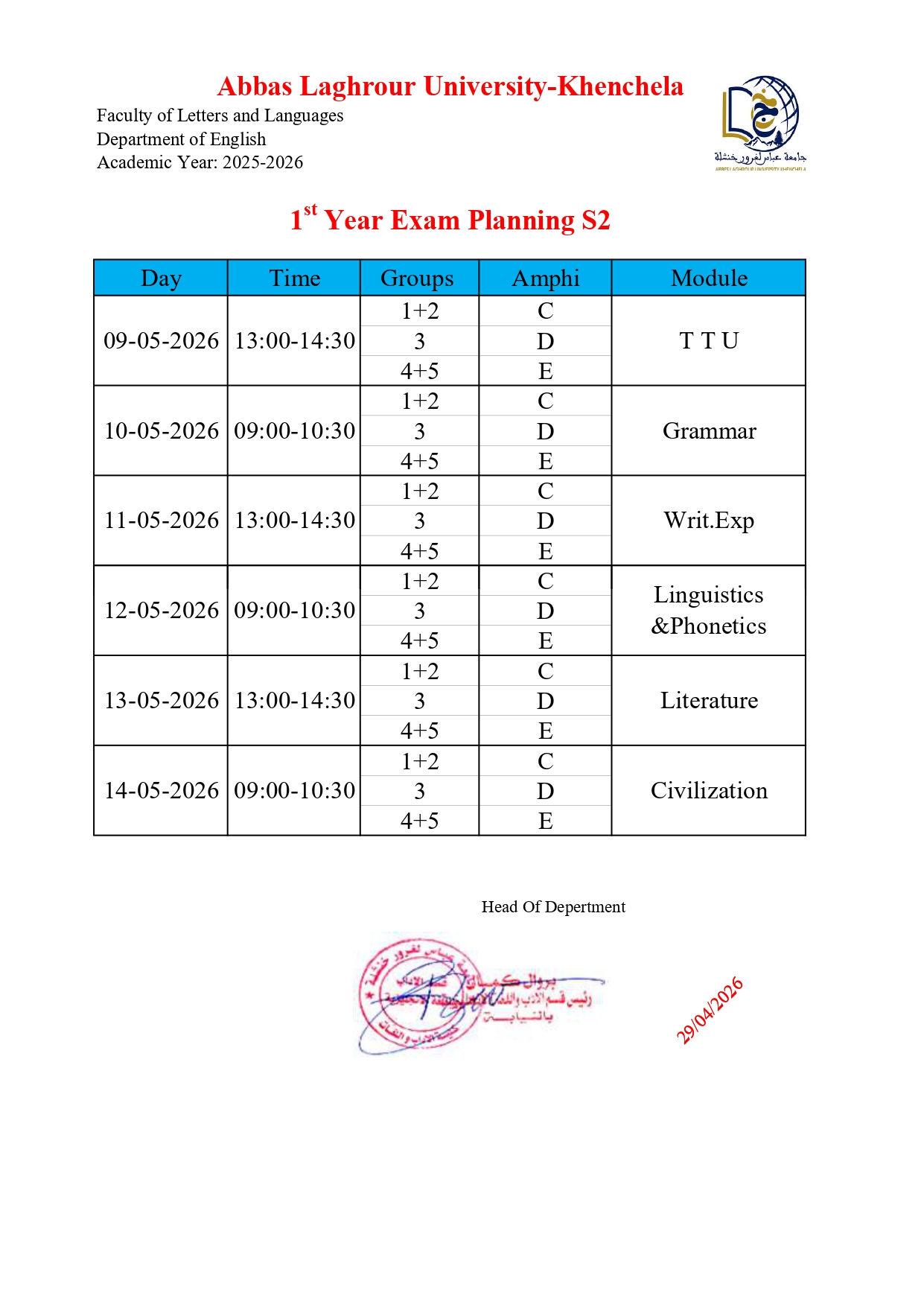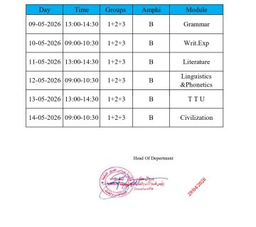 برنامج الإمتحانات-قسم اللغة الانجليزية-ل1