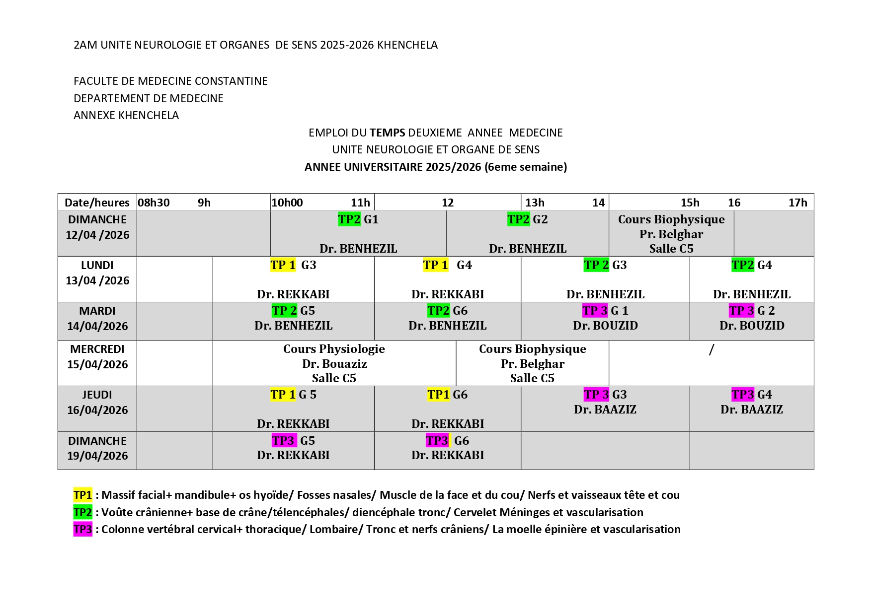 التوزيع الزمني سنة ثانية طب وحدة الاعصاب من 05 الى 09 افريل 2026 الاسبوع الخامس