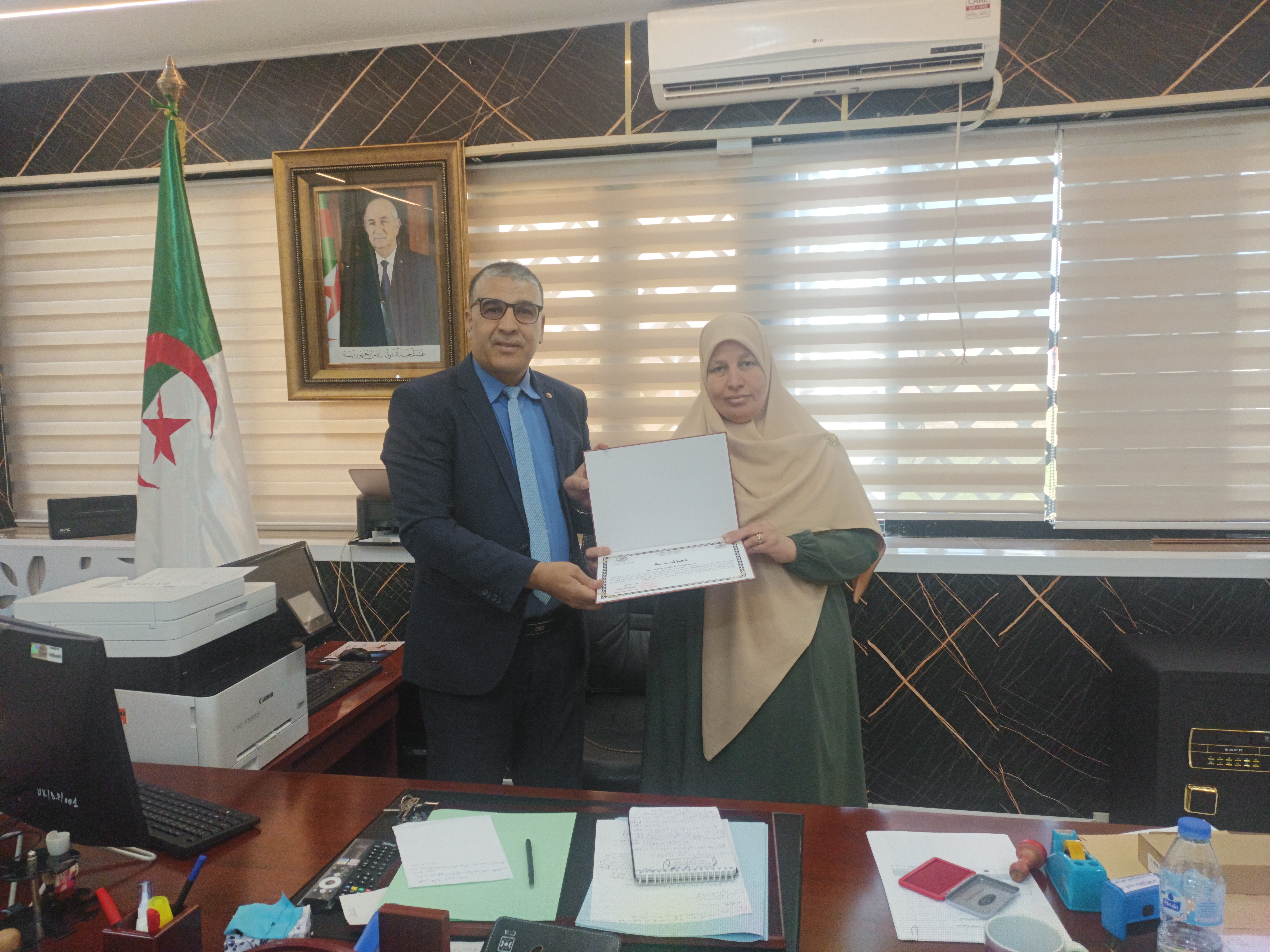 تمت اليوم تهنئة الدكتورة كواشي نجوى من طرف السيد العميد زواقري الطاهر بمناسبة مناقشتها أطروحة دكتوراه العلوم وحصولها على شهادة الدكتوراه في القانون الجنائي من جامعة الحاج لخضر باتنة .