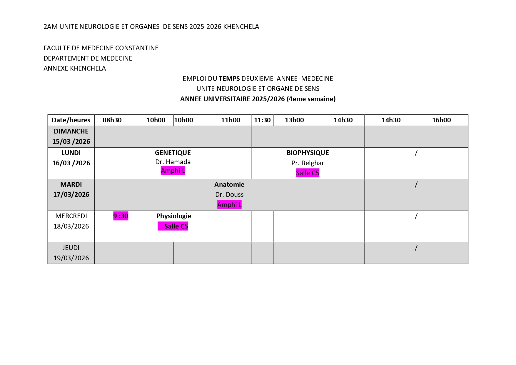 جدول توقيت السنة الثانية طب – وحدة علم الأعصاب.