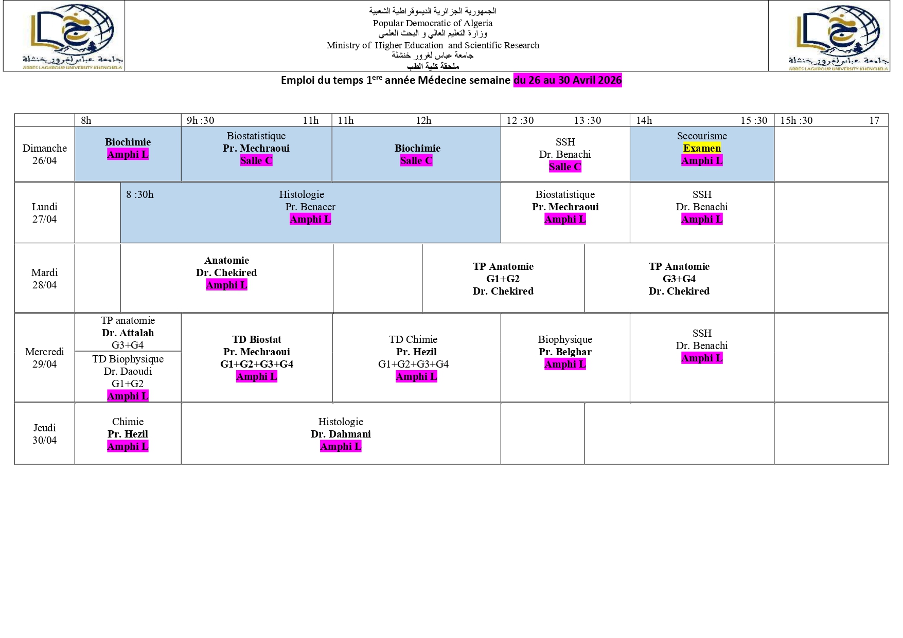 التوقيت الاسبوعي سنة اولى طب من 05 الى 09 افريل 2026