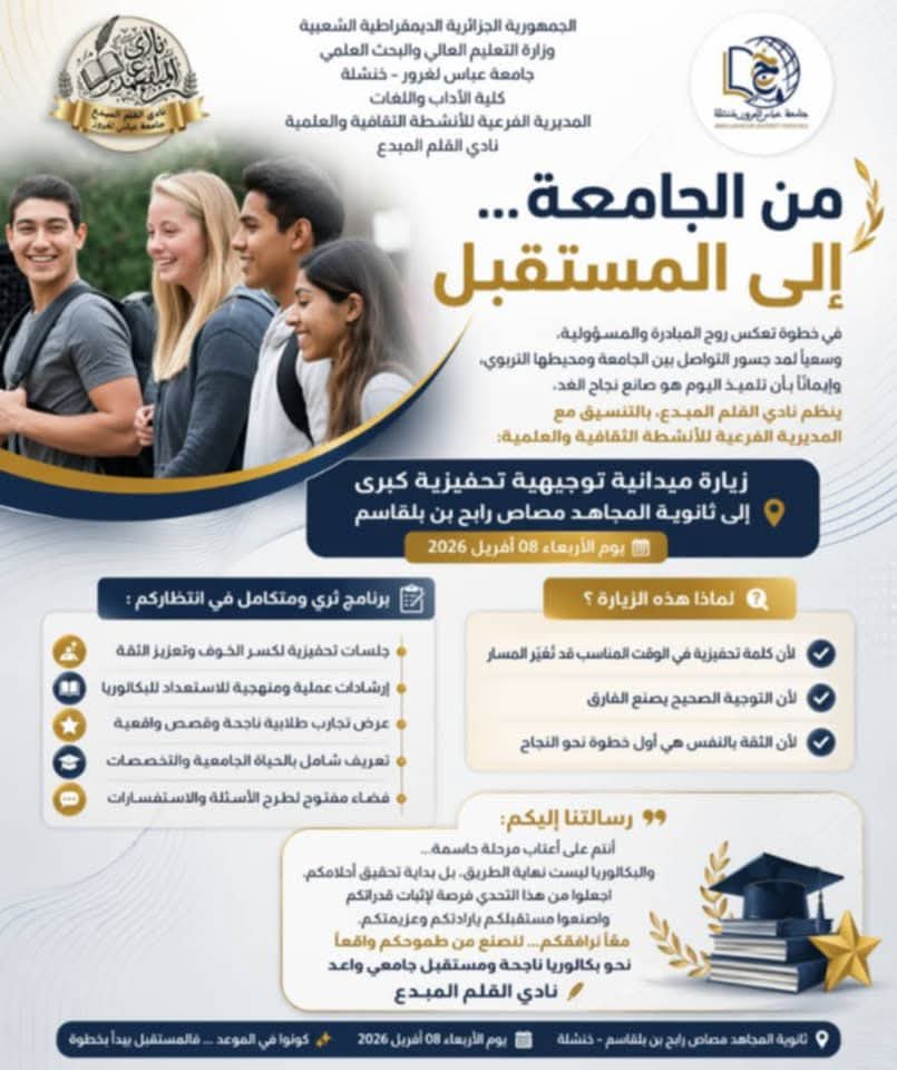 نظمت كلية الاداب واللغات مع نادي القلم المبدع خرجة ميدانية الى ثانوية الشهيد مصاص رابح طريق فرنقال في إطار التحضير النفسي والتحفيزي لتلاميذ الأقسام النهائية المقبلين على امتحان شهادة البكالوريا، ، وذلك يوم الأربعاء 08/04/2026 على الساعة 10:00 صباحًا بمدرج الثانوية، بحضور نخبة من طلبة الكلية وأعضاء النادي تحت إشراف أساتذة جامعيين ورئيسة النادي الطالبة سعيدي ريان.