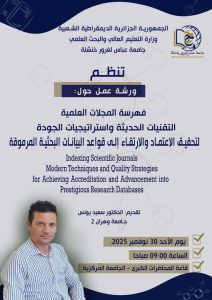 ورشة عمل حول: فهرسة المجلات العلمية: التقنيات الحديثة واستراتيجيات الجودة لتحقيق الاعتماد والارتقاء إلى قواعد البيانات البحثية المرموقة؛ تنظمها جامعة عباس لغرور خنشلة، تقديم الدكتور سعيد يـونس.