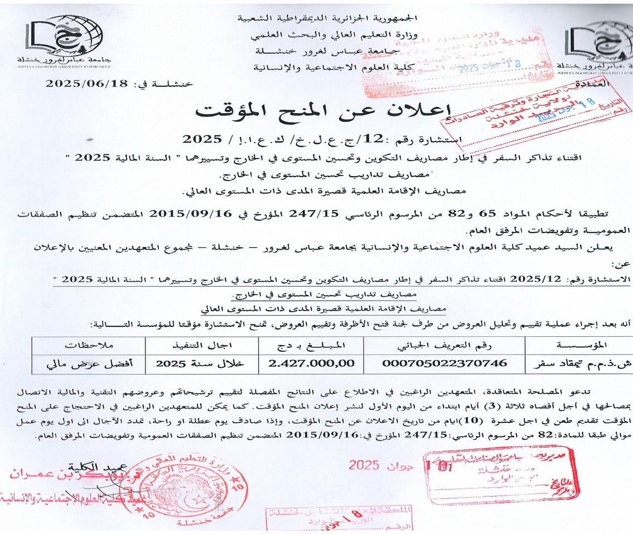 إعلان عن المنح المؤقت للاستشارة رقم 25/2025