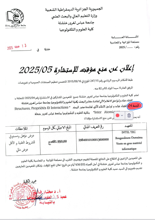 إعلان عن منح مؤقت الاستشارة رقم 05 الحصة 04