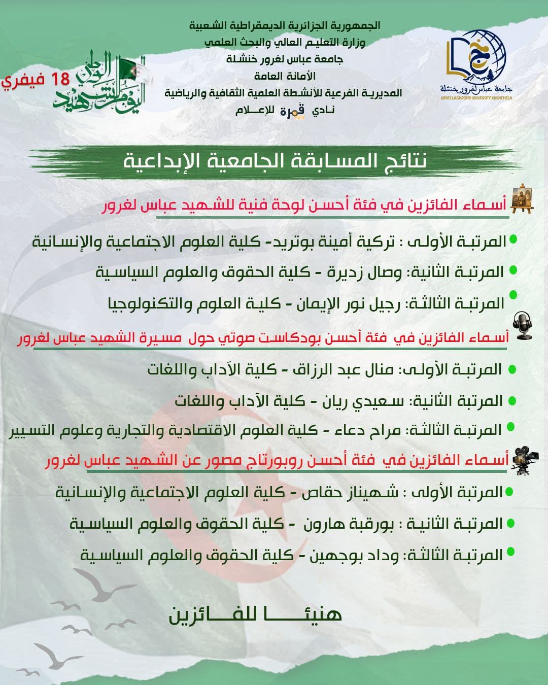 شارك نادي القلم المبدع لكلية الاداب واللغات في المسابقة الجامعية الابداعية الذي تظمه نادي قمرة للاعلام في احسن بودكاست صوتي حول مسيرة الشهيد عباس لغرور وهذا بمناسبة يوم الشهيد المصادف من كل سنة في 18 فيفيري بفوز الطالبتين :