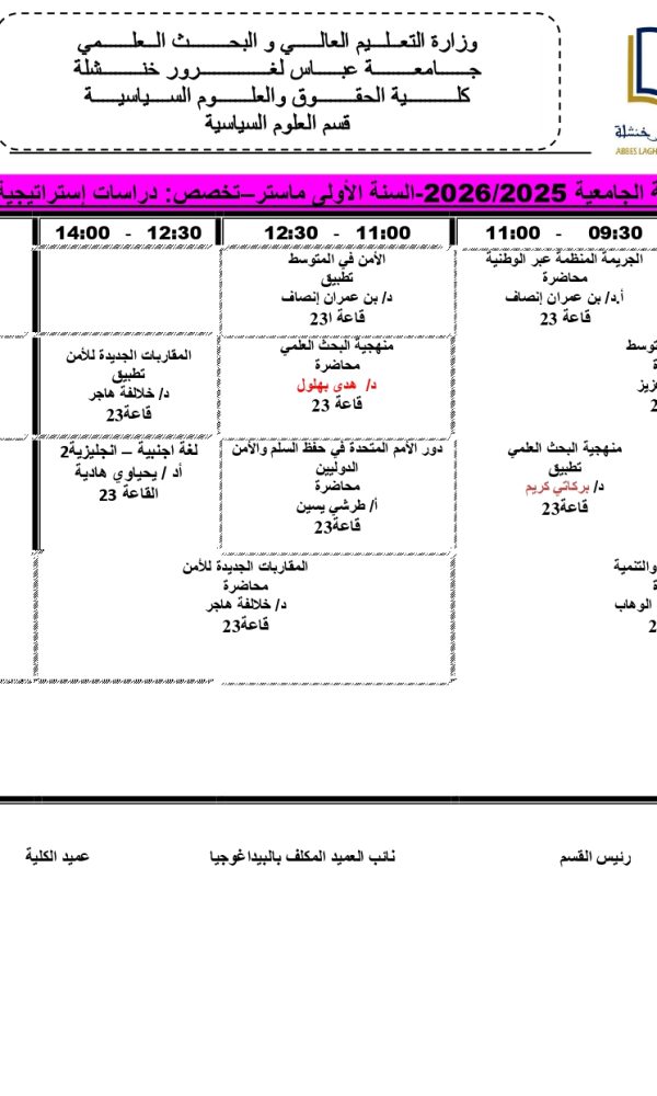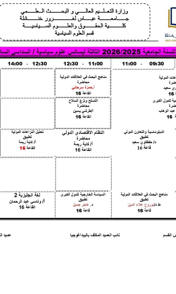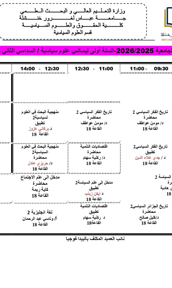 إعلان لفائدة طلبة السنة الأولى علوم وتكنولوجيا تعلم إدارة قسم العلوم والتكنولوجيا كافة طلبة السنة الأولى بان تم تحيين التوزيع الزمني الخاص بالسداسي الأول للسنة الجامعية 2025/2026 كما هو مبين في المرفقات, بالتوفيق للجميع ...اقرأ أكثر
