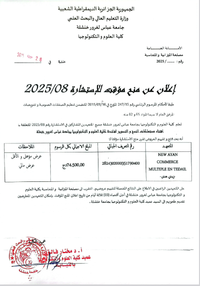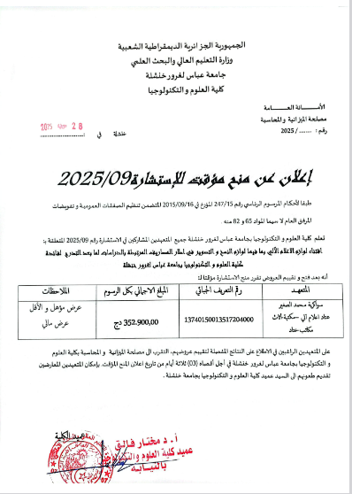 إستشارة رقم:2025 /17 إقتناء عتاد الإعلام الآلي لفائدة كلية الآداب واللغات التحميل...اقرأ أكثر