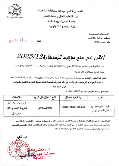 إستشارة رقم:2025 /04 خدمات الإيواء والإطعام في إطار مصاريف قسم الدكتوراه لفائدة كلية الآداب واللغات...اقرأ أكثر