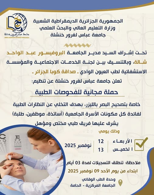 في انتظار الاعتمادات المالية لسنة 2026، تعلن اللجنة عن الانطلاق تدريجيا لنشاطها لهذه السنة ، و نبدأ على بركة الله بالرعاية الصحية، بالاعلان عن بداية التعامل مع العيادات و المخابر المتعاقد معها من قبل، وهي -للتذكير- : *عيادة الوداد (لغماسي) بخنشلة. *مركز البلسم الشافي (لحماري) بخنشلة. *عيادة الوليد بقايس – خنشلة *مخبر التحاليل -الحكمة – خنشلة *مخبر التحاليل – الفضيلة- خنشلة. وذلك ابتداء من تاريخ : 25 جانفي 2026 شفاكم الله و عفاكم...اقرأ أكثر