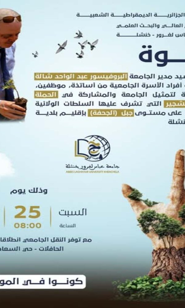 أسرة جامعة عباس لغرور خنشلة؛ من قلب الحدث تلبي النداء وتشارك بكل مكوناتها في حملة التشجير الوطنية؛ بمنطقة جبل الجحفة، إقليم بلدية بابار- ولاية خنشلة....اقرأ أكثر