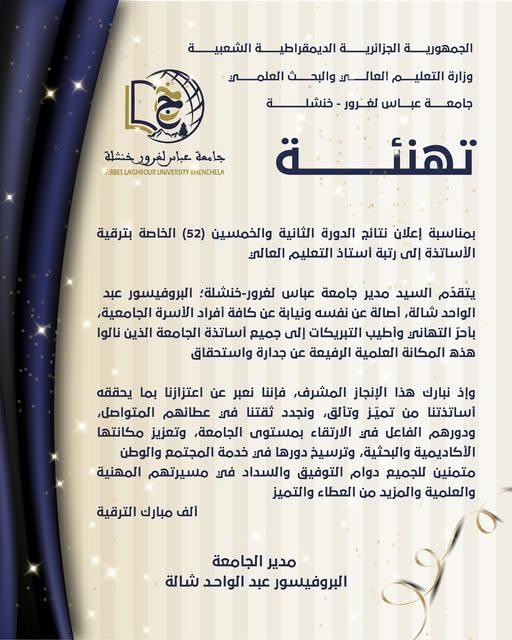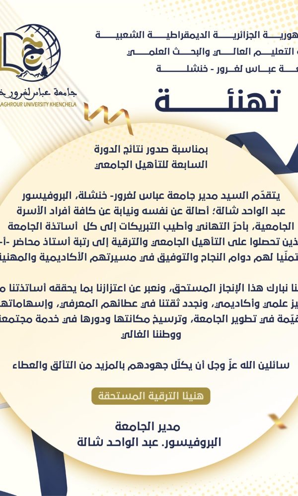 تتشرف رئاسة جامعة عباس لغرور بدعوة كافة أعضاء المجتمع الجامعي والجمهور العام لحضور الحفل الرسمي لتكريم الطلبة المتفوقين أكاديمياً، والذي سيقام: 📅 التاريخ: الخميس 03 جويلية 2025 🕒 الوقت: (الساعة السابعة مساءا ) 🏛️ المقر: الجامعة المركزية – الحامة تكريم الطلبة الأوائل في جميع التخصصات. عرض إنجازات البحث العلمي البارزة خلال العام. كلمة رئيس الجامعة حول مسيرة التميز الأكاديمي. توزيع الجوائز التشجيعية والمنح الدراسية....اقرأ أكثر
