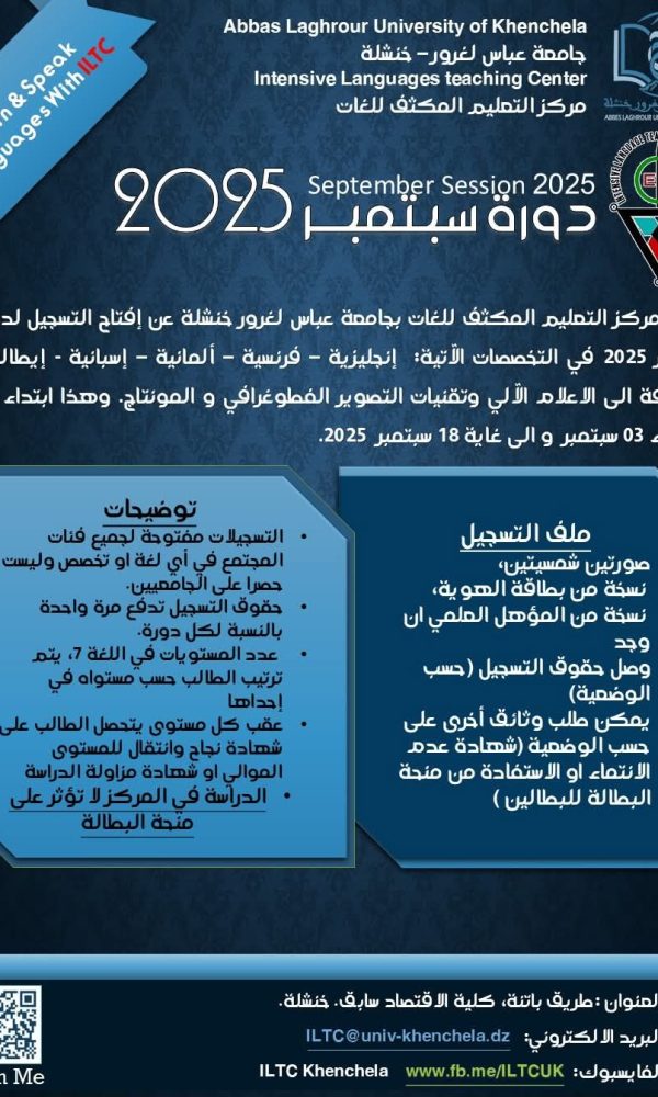 تعلن إدارة جامعة خنشلة عن فتح باب الترشح للتسجيل في طور الماستر خلال الفترة الممتدة من 04 إلى 11 سبتمبر 2025. التسجيل في طور الماستر كلية الآداب واللغات: فتح باب الترشح للتسجيل في الطور الثاني ماستر ———————————————————————————————– التسجيل في طور الماستر كلية الحقوق والعلوم السياسية: الإعلان للتسجيل في الطور الثاني ماستر للسنة الجامعية 2025-2026 لفئة 80% و 20 % ———————————————————————————————– التسجيل في طور الماستر كلية العلوم والتكنولوجيا: فتح الترشح للتسجيل في الطور الثاني الماستر ———————————————————————————————– التسجيل في طور الماستر كلية العلوم الإجتماعية والإنسانية فتح الترشح للتسجيل في الطور الثاني الماستر ———————————————————————————————– التسجيل في طور الماستر كلية علوم الطبيعة والحياة الترشح للالتحاق بطور الماستر فئة %20 الترشح للالتحاق بطور الماستر فئة %80 التسجيل في طور الماستر كلية العلوم الإقتصادية ،التجارية وعلوم التسيير: فتح باب الترشح للتسجيل في الماستر فئة 20% التسجيل في الطور الثاني (الماستر) لفائدة الطلبة المتحصلين على شهادة الليسانس من الكلية دفعة 2025...اقرأ أكثر