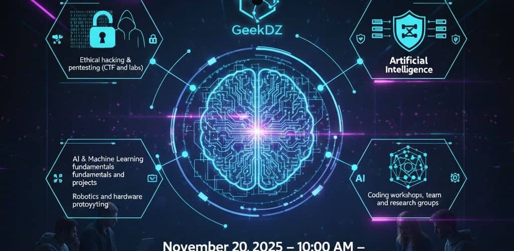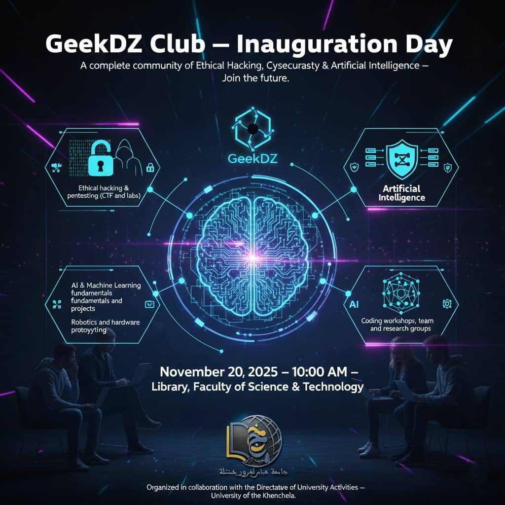 We are pleased to announce the official launch of the GeekDZ Club, the comprehensive university community covering Cybersecurity, Ethical Hacking, and Artificial Intelligence at the University of Khenchela.