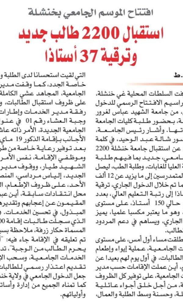 Breast cancer awareness day Organized today, October 16, 2025; The Medical Attaché and the Med Inspire Club, in addition to the Sub-Directorate for Scientific, Cultural and Sports Activities, in addition to the Preventive Medicine Unit at Abbas Lagrour Khenchela University, and in coordination with the Healing Balsam Clinic, held a awareness-raising day about breast cancer. During this day, lectures were given by doctors and university professors, all centered around introducing this disease and the importance of early detection and ways to prevent it. This activity was supervised by the University Rector, as well as the Medical Attaché Officer, Dr. Radwan Takawat; In the presence of the Vice Chancellors, the deans of the colleges, and various university officials and administrators, in addition to the professors and students, Dr. Lahmari Rashid, Dr. Salim Lachhab, and the midwife Aisha Khallaf were also among those present at the activities of this awareness day. During the evening, the activity included a radiology and diagnostic campaign supervised by female doctors and midwives. For the benefit of university employees....اقرأ أكثر