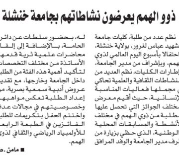 Press coverage by Al-Umma Al-Arabiya newspaper – the scientific activity hosted by Abbes Laghrour University Khenchela under the supervision of the university director, the Algerian scientist Bashir Halimi. press