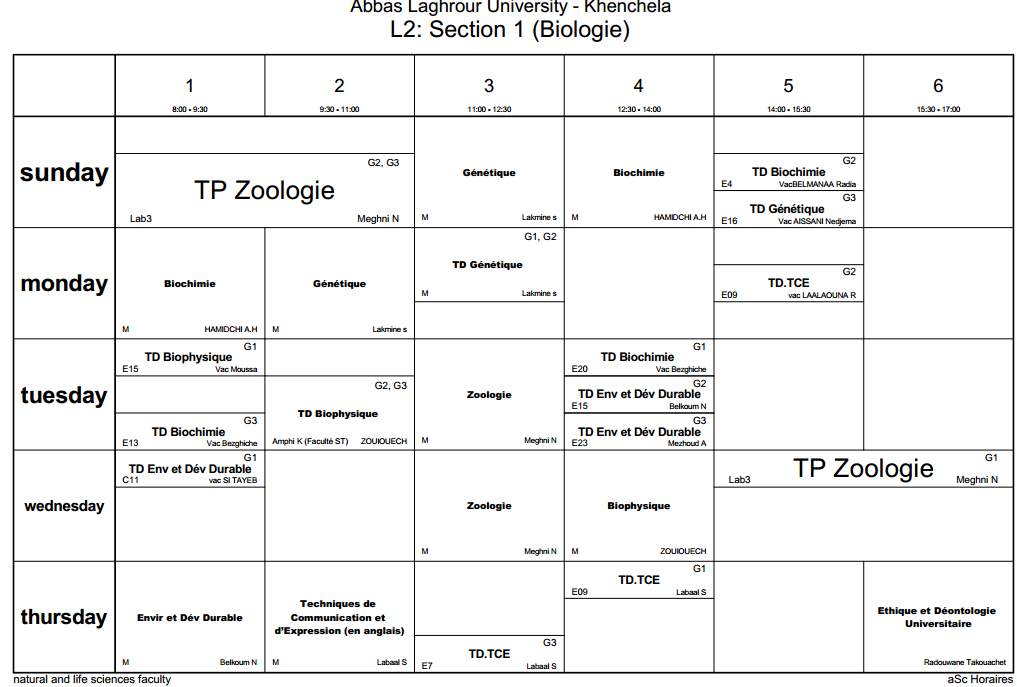 Timetable Department of Natural and Life Sciences-L2