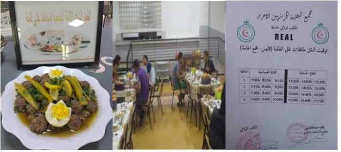 This support includes university catering services, which provide three complete meals (breakfast, lunch, and dinner) daily. These services are available to all students through five restaurants located within university residences, in addition to two central restaurants situated in El Hamma and at the Abdelhak Brarahi University Campus.