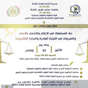 • IN, 3 November 2025, the Directorate of Trade of the Province of Khenchela, in coordination with Abbas Laghrur University of Khenchela – through the Faculty of Law and Political Science and the Faculty of Economics, Business and Management Sciences – and the Provincial Chamber of Commerce and Industry – Chellia, the Provincial Office of the General Union of Traders and Craftsmen, a study day on consumer rights in terms of information and advertising of prices and tariffs in regular and e-commerce, with the participation of various representatives of the sectors concerned, as well as professors specialising in economics and law and consumer protection associations. They presented scientific papers on the subject of transparency in price display and the regulation of various commercial practices, as well as consumer protection mechanisms in the context of the shift towards e-commerce and the importance of legal awareness in protecting the rights of consumers.