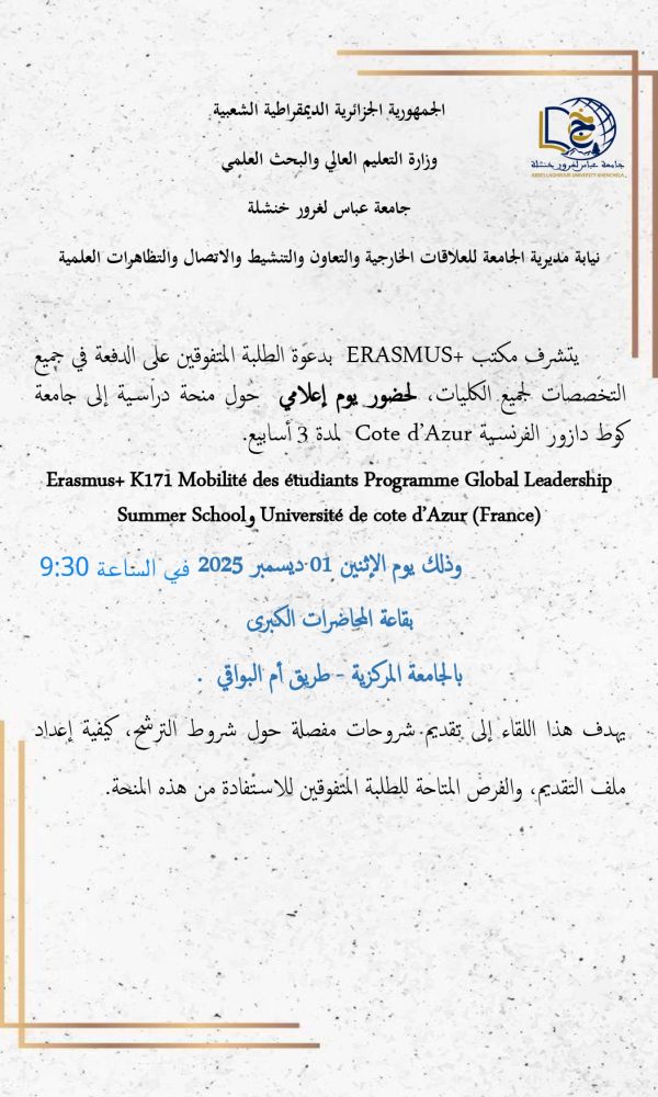 In the context of finalizing the nomination list for the University Academic Council elections for both the professorial and assistant professorial ranks, and given the lack of a quorum of candidates to date, it has been decided to extend the nomination deadline until Thursday, October 23, 2025. Accordingly, we invite all professors wishing to run for the position of University Academic Council member, which constitutes a fundamental pillar of the university. Greetings to all. ... اقرأ أكثر