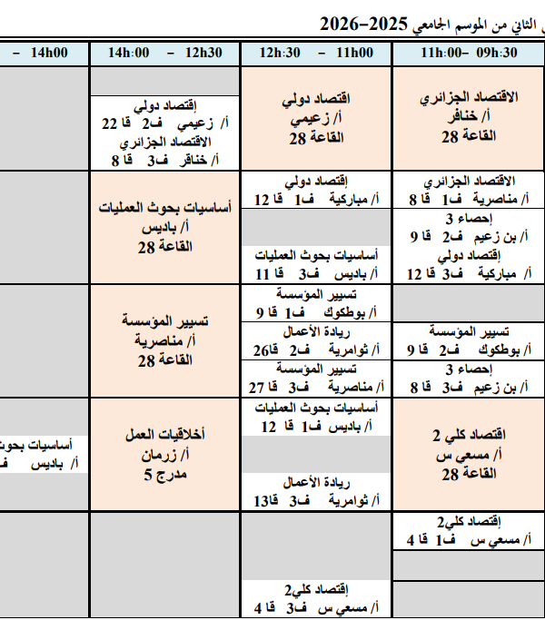 Weekly timetable for the second semester of the 2025-2026 academic year, second year, Economicsكلية العلوم الاقتصادية, التجارية و علوم التسيير2026-01-22
