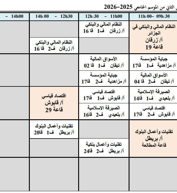 Weekly timetable for the second semester of the 2025-2026 academic year, third year, Monetary and Financial Economicsكلية العلوم الاقتصادية, التجارية و علوم التسيير2025-12-18