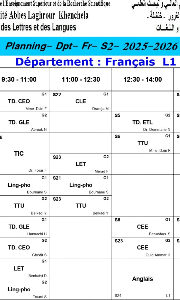 Timetable for the Department of French Language and Literature L1