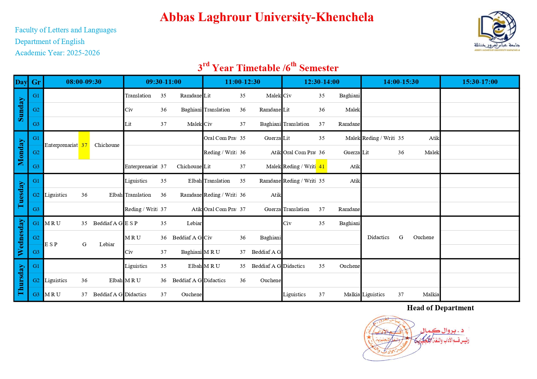 Timetable Department English Language -L3